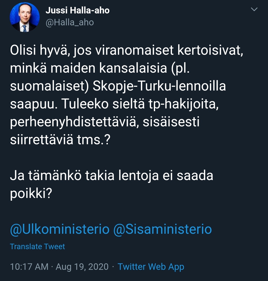 Sebastian Tynkkynen ×'×××××ר Kiitos Jussi Halla Aho Fixit from pbs.twimg.com Perussuomalaisten puheenjohtaja, kansanedustaja / chairman of finns party, member of parliament we/us/our. Archived 28 jun 2020 08:43:10 utc. Share download.zip report bug or abuse donate. Biaya member 100k se umur hidup chat whatsaap 089653437629 | twuko. 2/2 jos trump olisi tviittaillut (ja ehkä tviittailikin). Miehelle on annettu mahdollisuus perua ja pyytää anteeksi. 4/4 totean lopuksi, että tarkoitukseni ei ole rinnastaa asiatonta tviittailua seksuaalirikoksiin tai vaalilahjontaan. Hän nousi puheenjohtajaksi dramaattisessa jyväskylän puoluekokouksessa vuonna 2017.