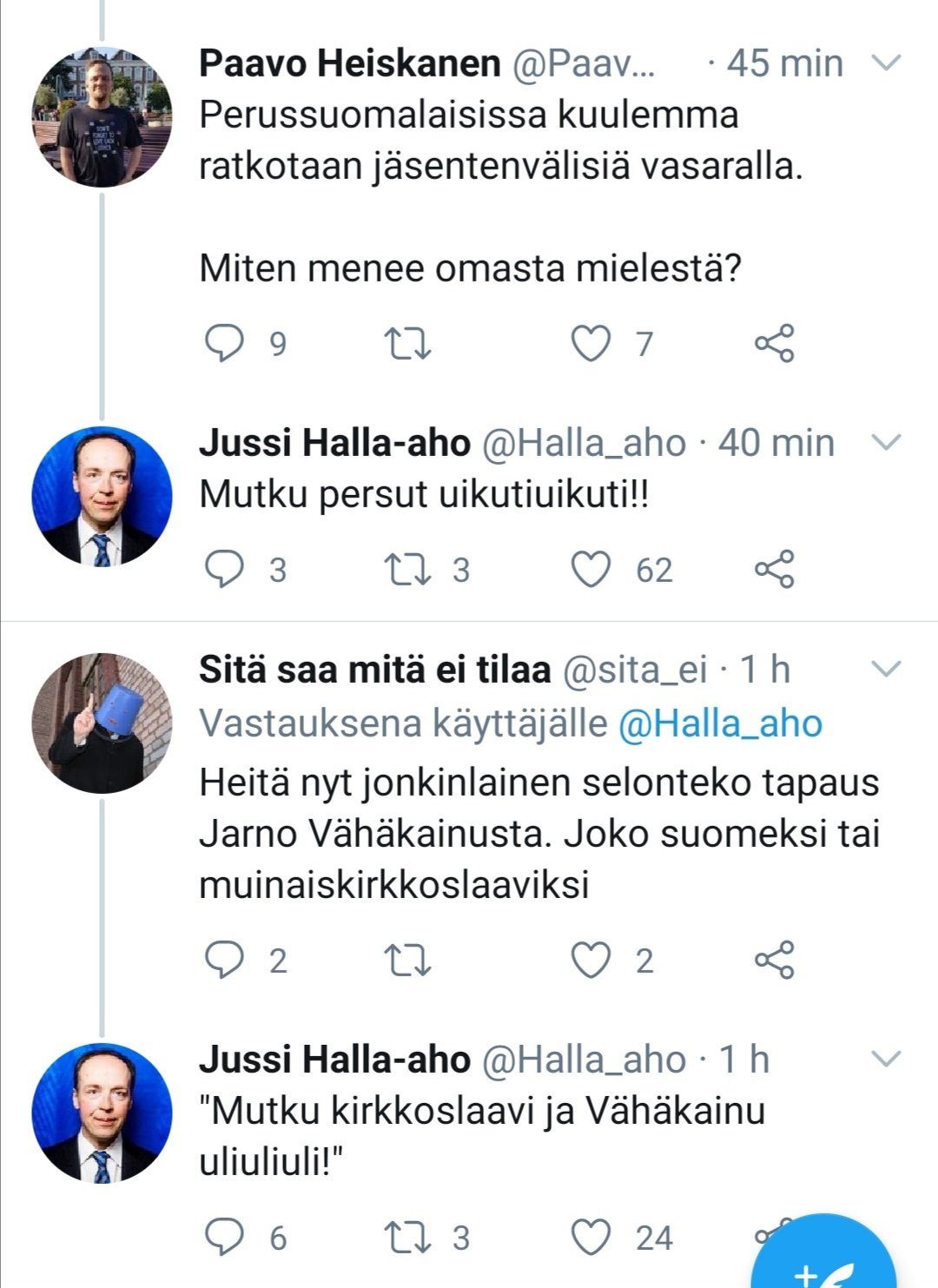 Petri Haapa On Twitter Kevaan Selvimpia Merkkeja On Se Kun Alkaa Halla Aholla Alkaa Kiima Aika from pbs.twimg.com Perussuomalaisten puheenjohtaja, kansanedustaja / chairman of finns party, member of parliament we/us/our. On lupaava ensi askel eheytymisen tiellä, että puheenjohtajisto perehtyy ps:n erinomaiseen ohjelmaan heti julkaisup… twitter.com/i/web/status/1… Archived 28 jun 2020 08:43:10 utc. 2/2 jos trump olisi tviittaillut (ja ehkä tviittailikin). Bekijk tweets over #halla_aho op twitter. Perussuomalaisten puheenjohtaja, kansanedustaja / chairman of finns party, member of parliament. Chequea la información sobre el desafío e intenta resolverlo en la. Miehelle on annettu mahdollisuus perua ja pyytää anteeksi.
